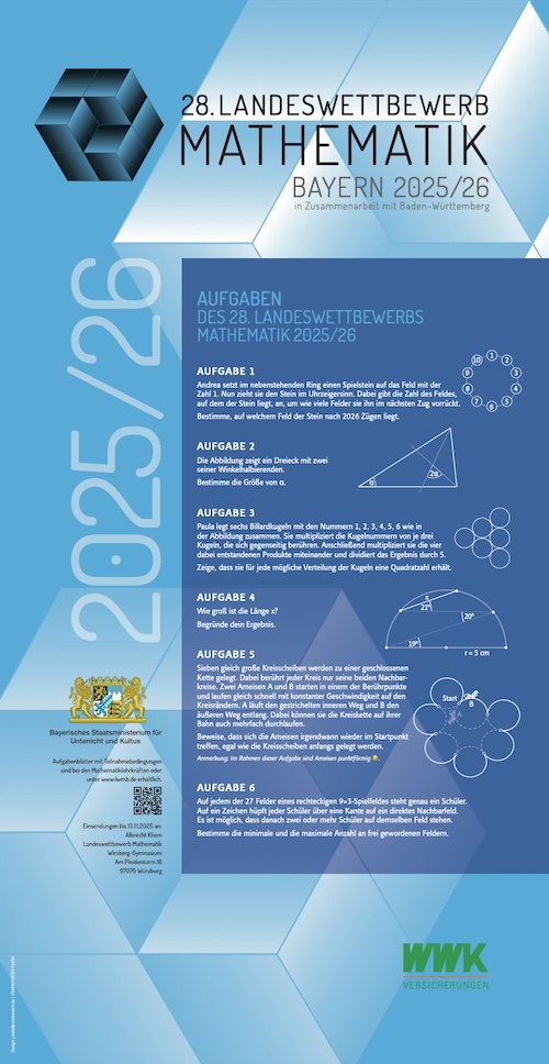 Die Aufgabenblätter des 28. LWMB sind zu Schuljahresbeginn an die Schulen geschickt worden. Sie stehen auch auf dieser Seite zum Download bereit. Bis zum Einsendeschluss am Donnerstag, 13. November habt ihr Zeit Lösungen für vier der sechs Aufgaben einzusenden. Im letzten Jahr haben knapp 1000 Schülerinnen und Schüler aus der Mittelstufe bayerischer Gymnasien und von Realschulen mitgemacht. Lösungen zu den Aufgaben der vergangenen Jahre gibt es hier im Archiv. Schon durch die Einsendung von zwei richtig bearbeiteten Aufgaben kann man einen Preis gewinnen. Viel Freude beim Knobeln! Gruppenarbeit (mit bis zu drei Schülerinnen und Schülern) ist möglich.